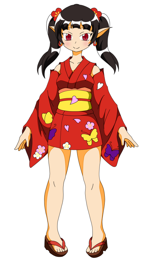 ・外見的特徴 : 長い黒髪を左右で二つに結んだ紅色の瞳の少女。 蝶や梅の模様が描かれた丈の短い赤の着物を好んで着ている。